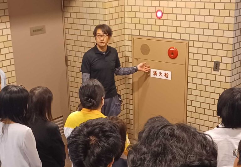 ・1Fエントランスホールに集合し、防火設備の使用方法や注意点の説明を受けました