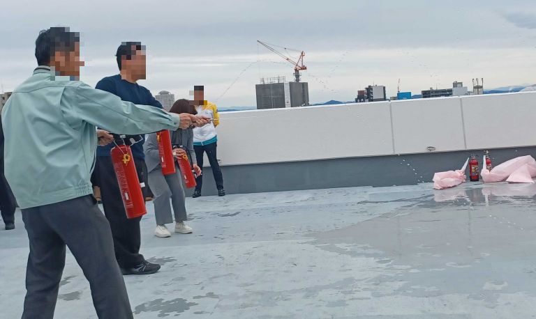 ・屋上に移動し、実際に消火器を使用した消火体験を行いました
